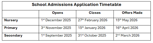 Applications have now closed online for Nursery September 2026. - If you still need to apply please visit the school, and we can give you a paper copy of the form. Any paper applications received are dealt with after the main applications received have been allocated schools.