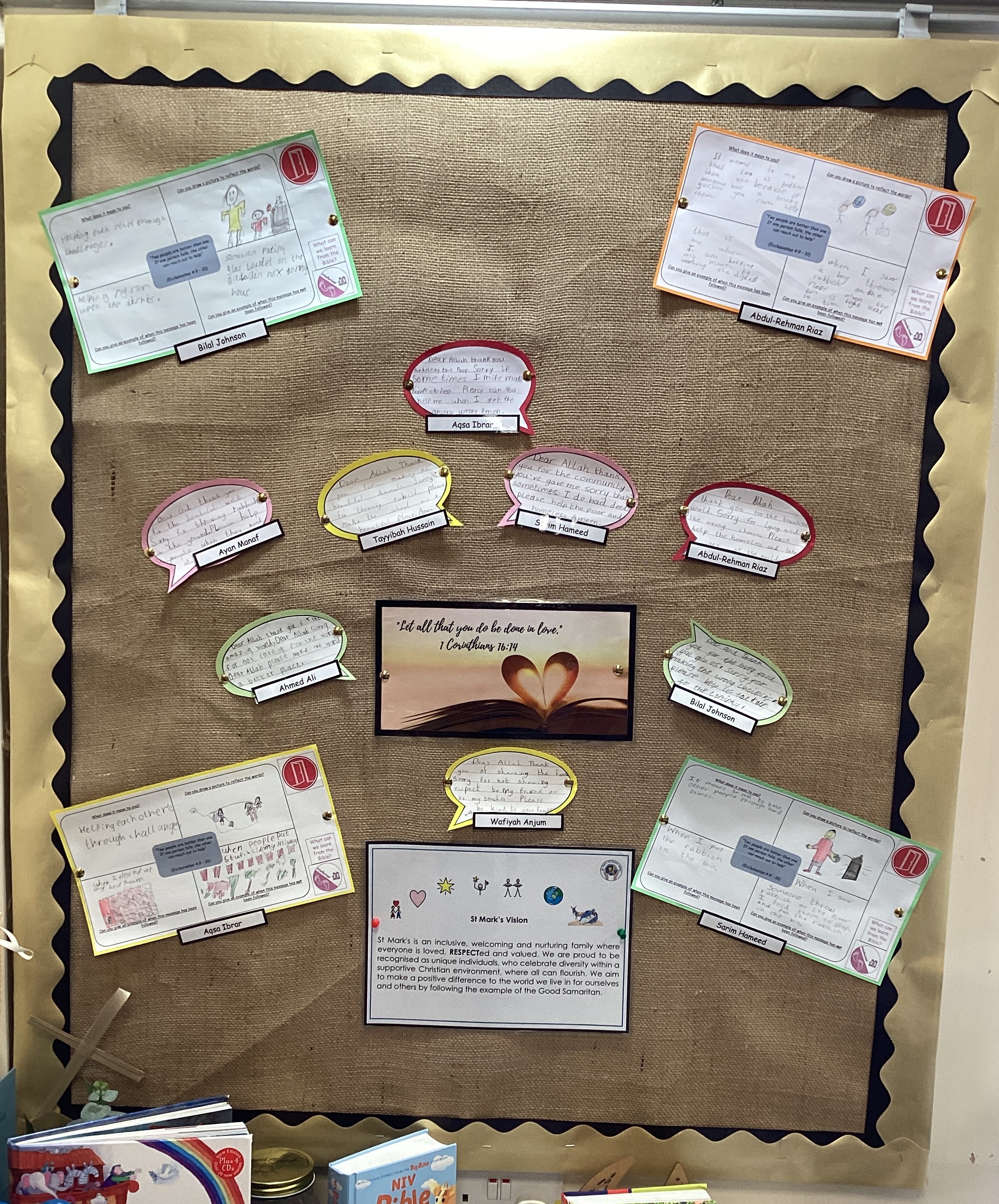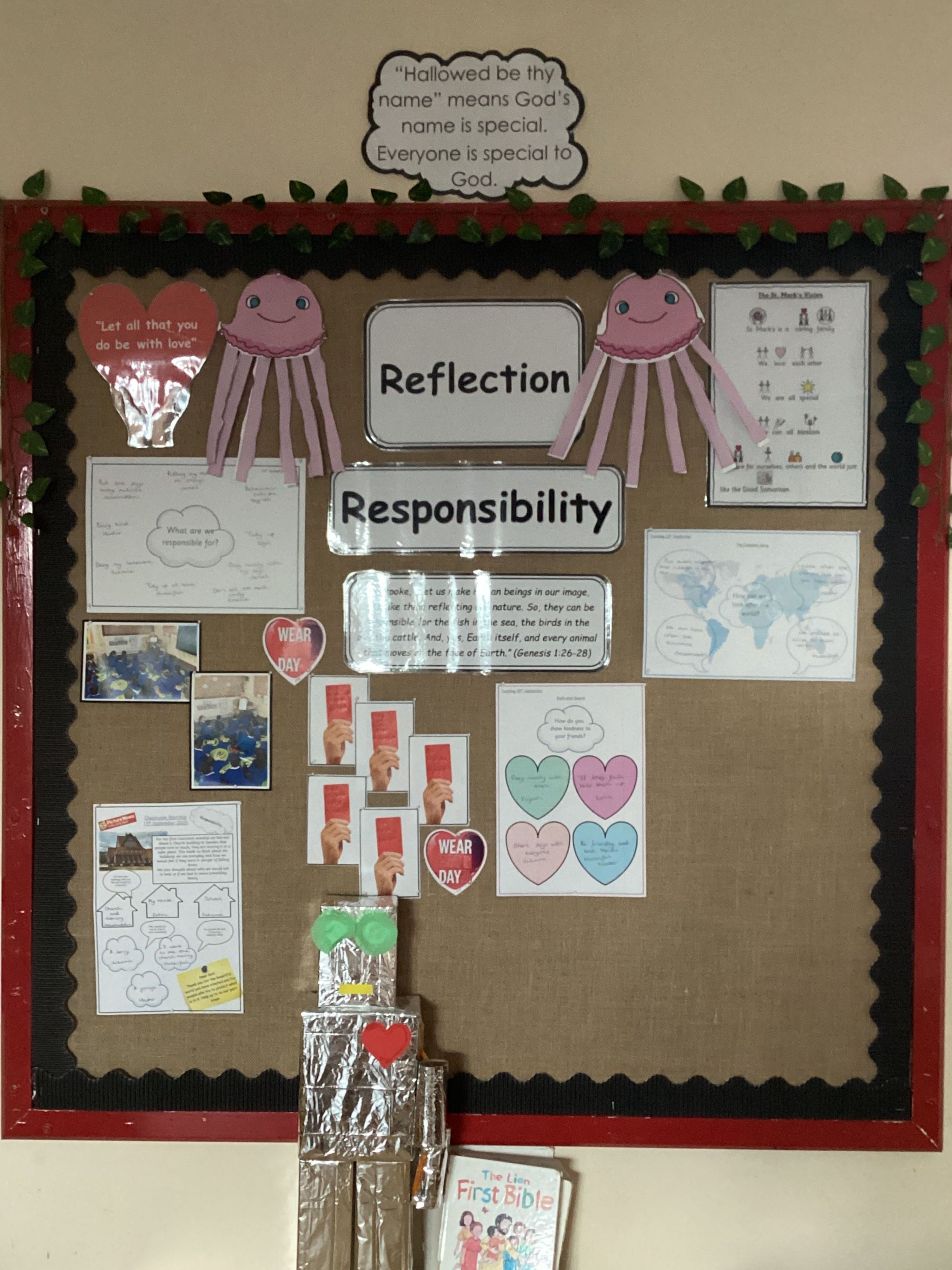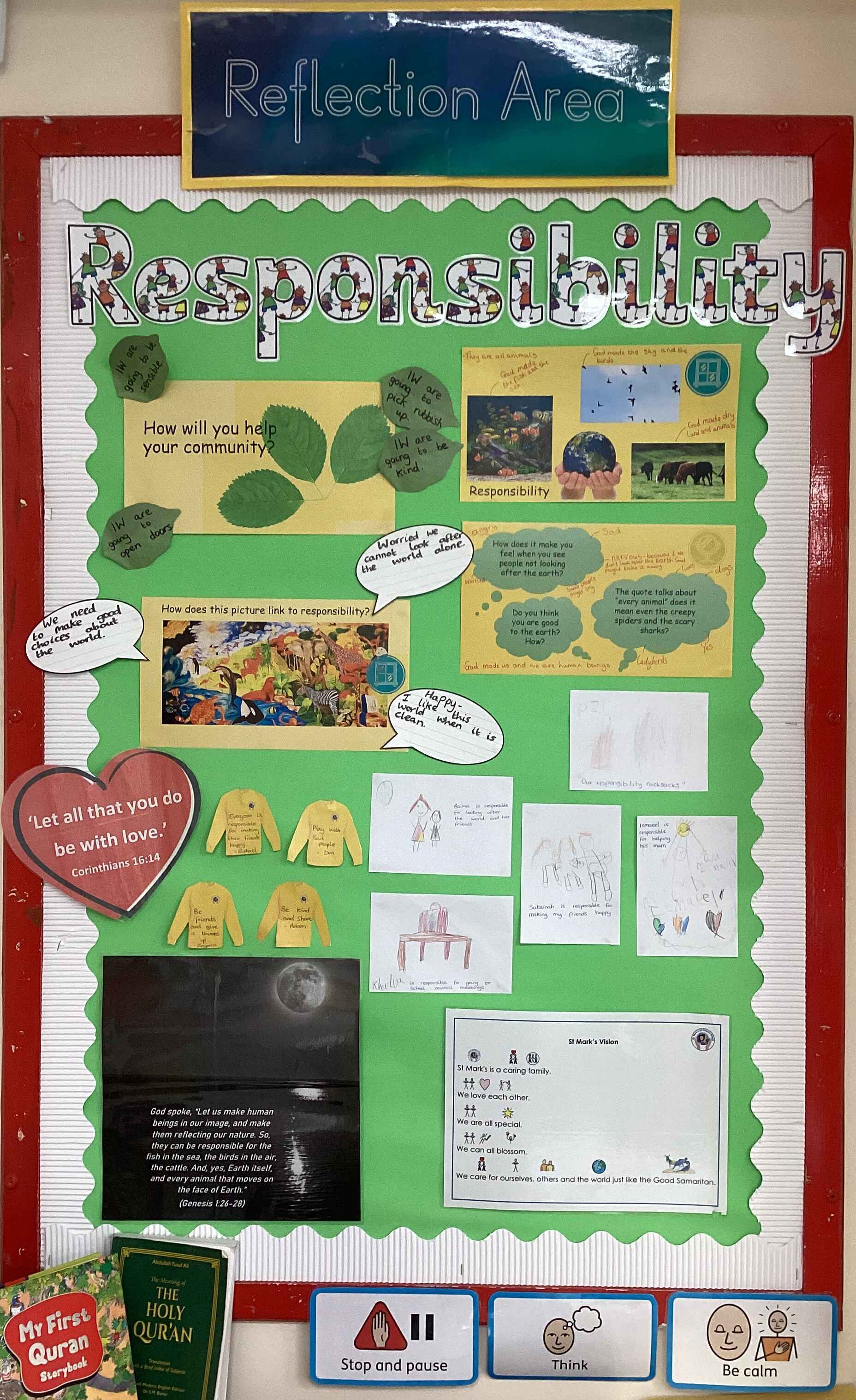 Every classroom within school has a reflection area, which displays the Bible quote linked to our school value for the half term. During the first classroom worship of the half term, this is shared and questions are posed to challenge Pupil’s thinking and understanding and provides time to reflect on how these impact on their own beliefs. Over the year, these are displayed as a reminder in the school corridor.