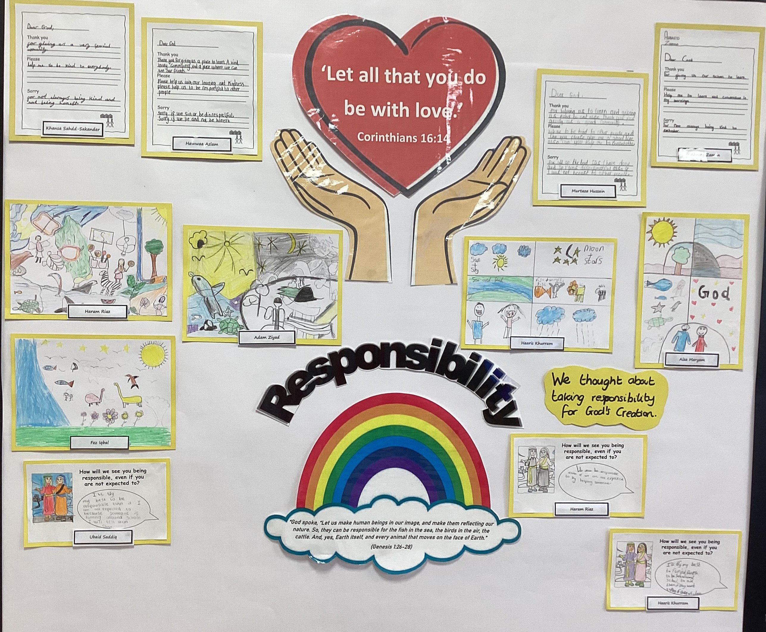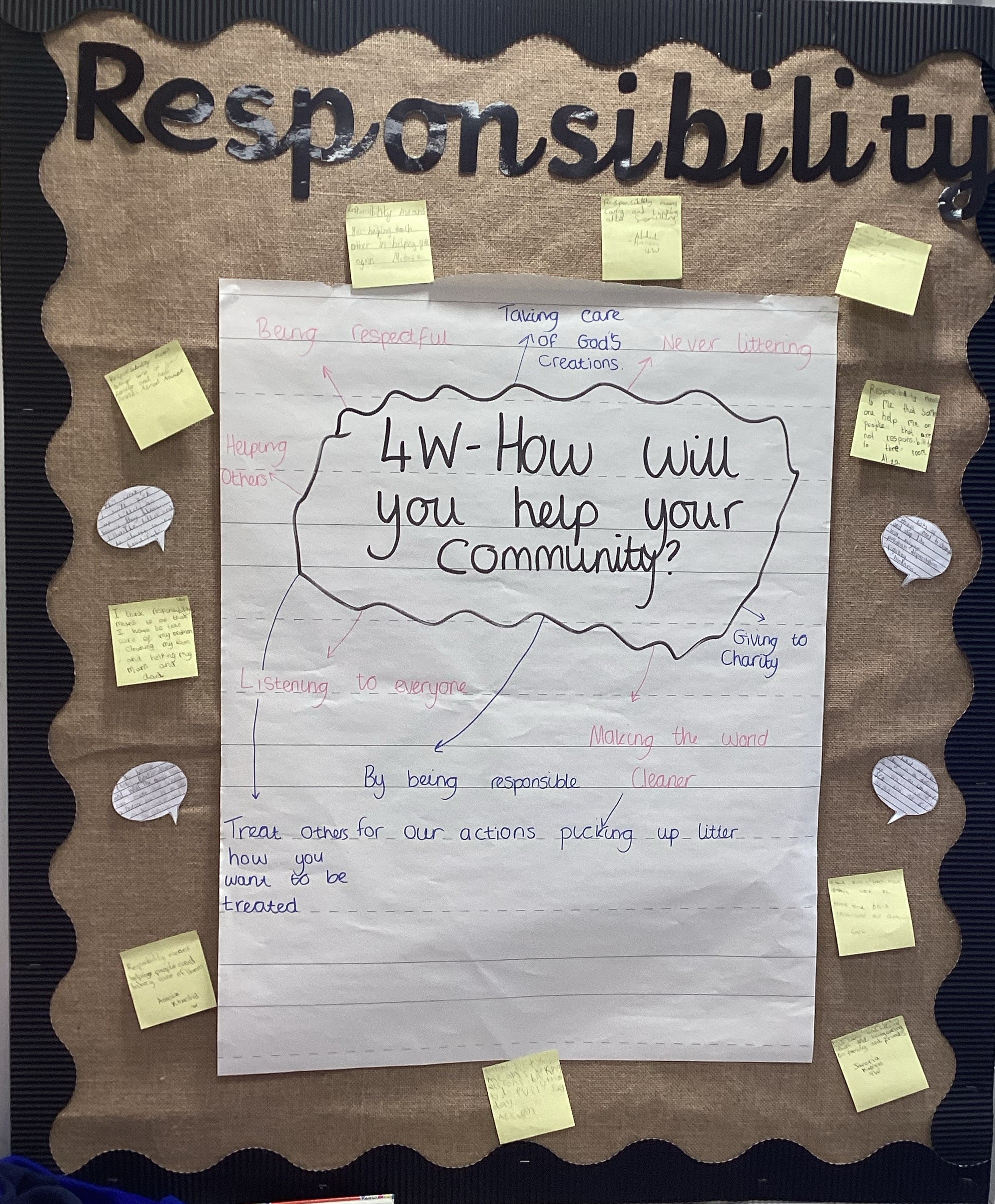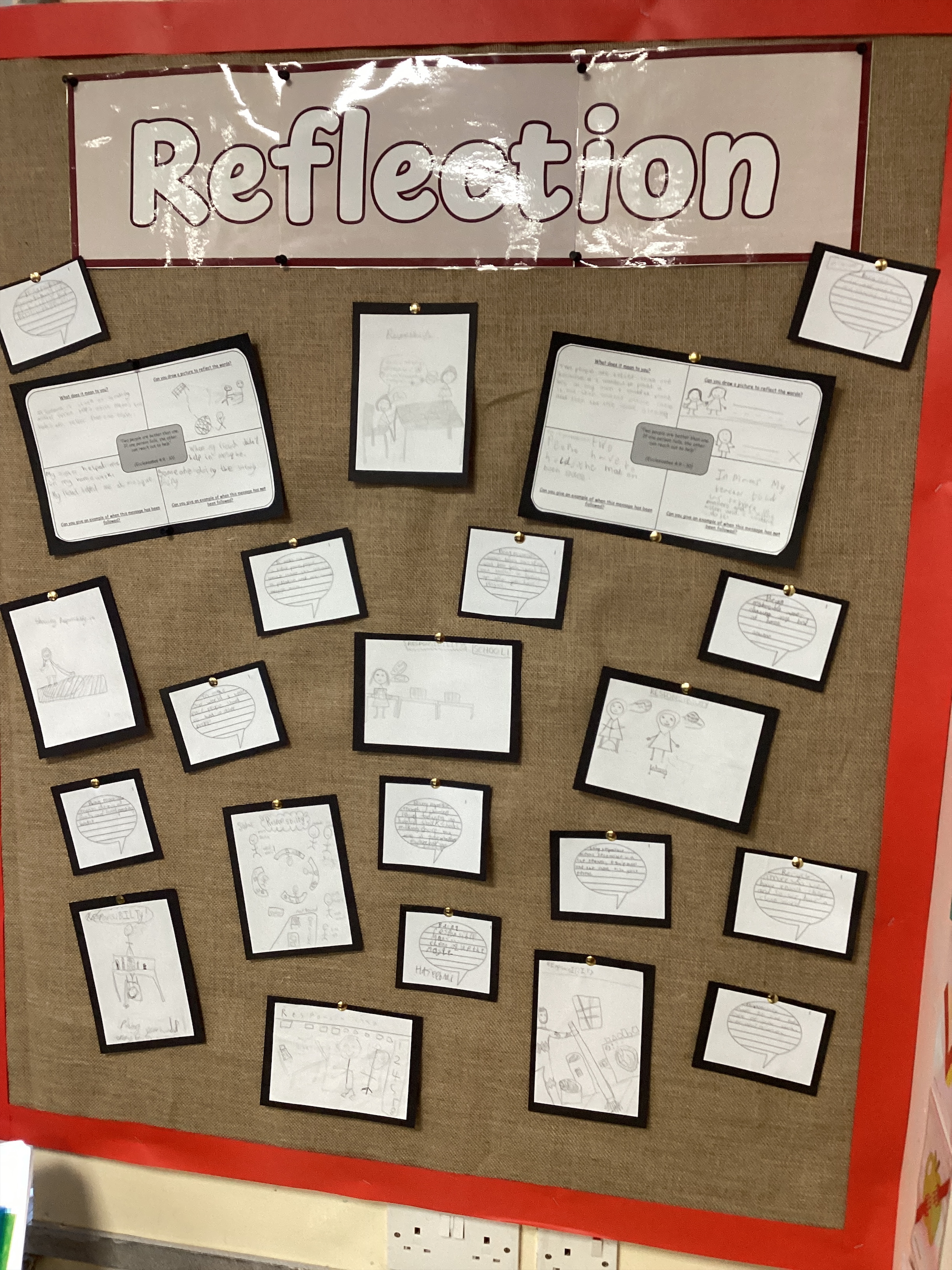 These are examples of work shown on reflection areas both inside and outside of the classroom. These were all based around our school value of RESPONSIBILITY.