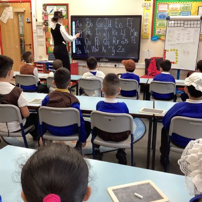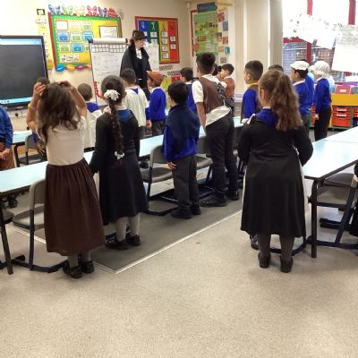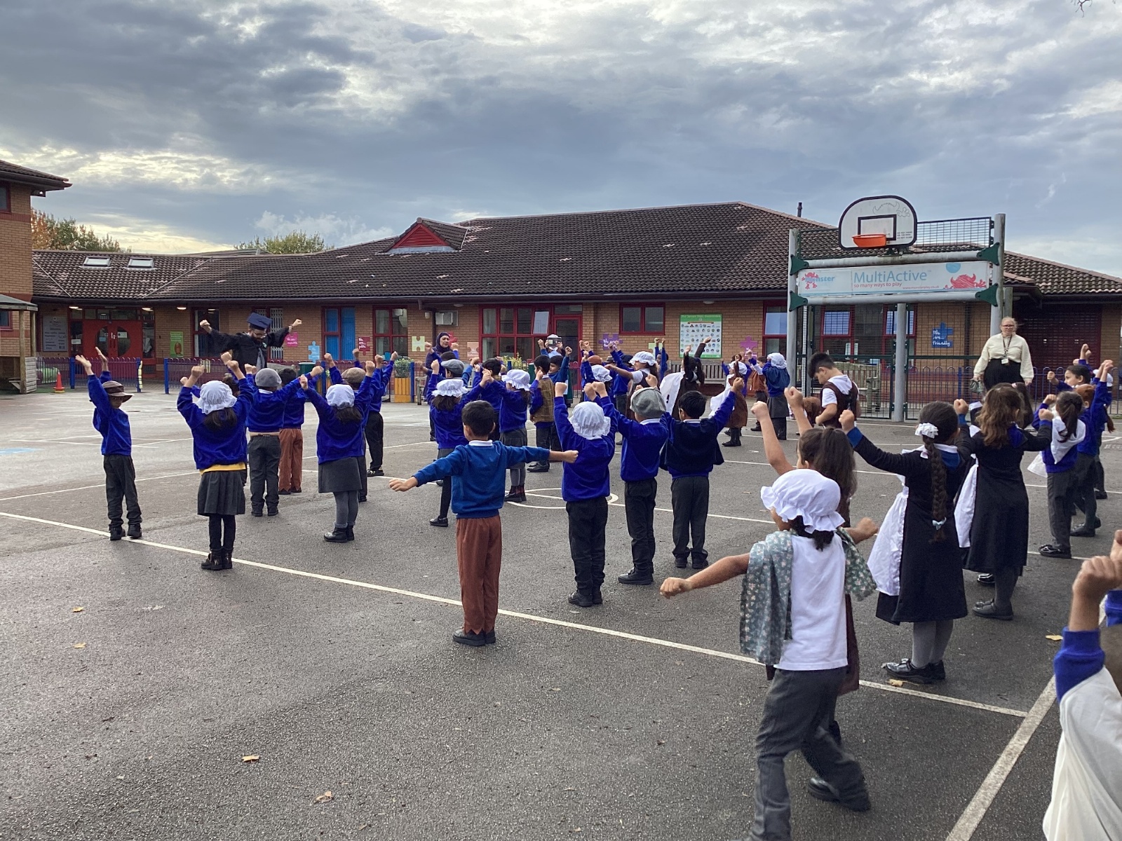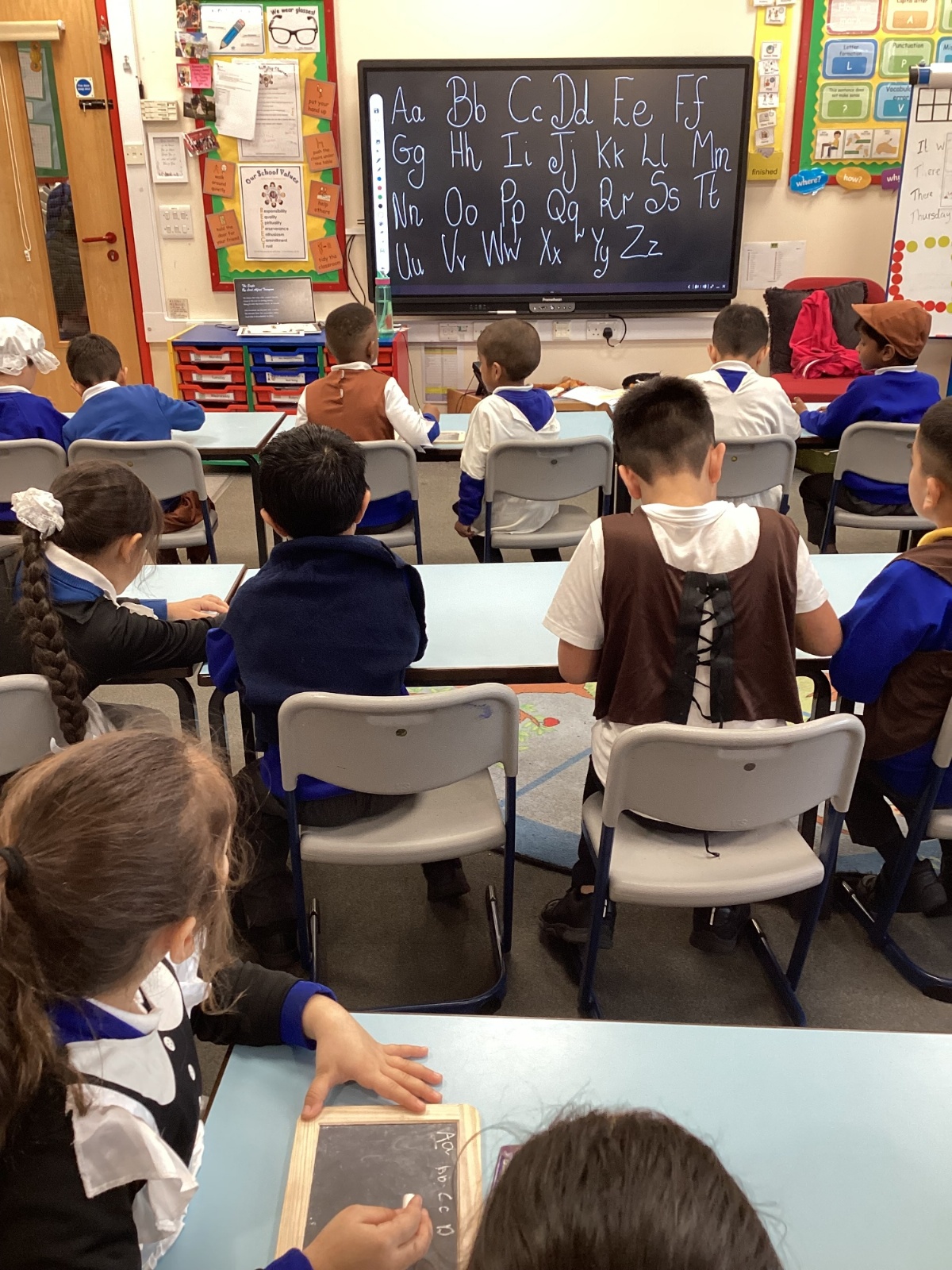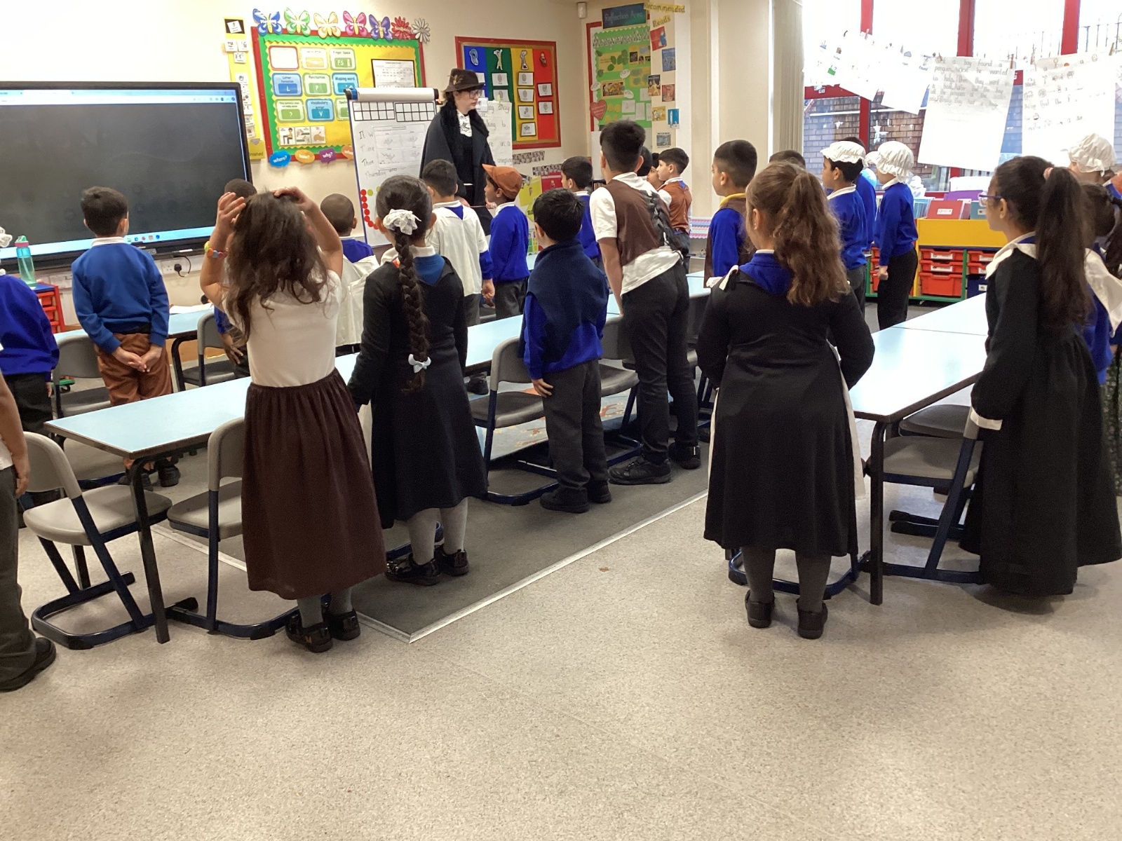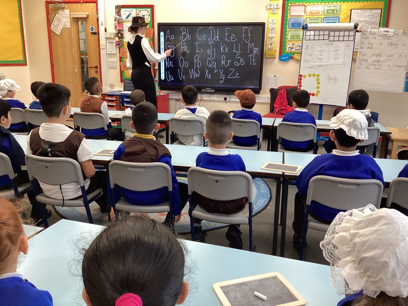 Year 1 travelled back into the past in school. The teachers were very mean and shouted a lot! There were so many strange rules to follow, like standing up to answer a question and only writing with your right hand. The children did Maths, PE and English but were rather bored because they had to do a lot of copying the teacher.