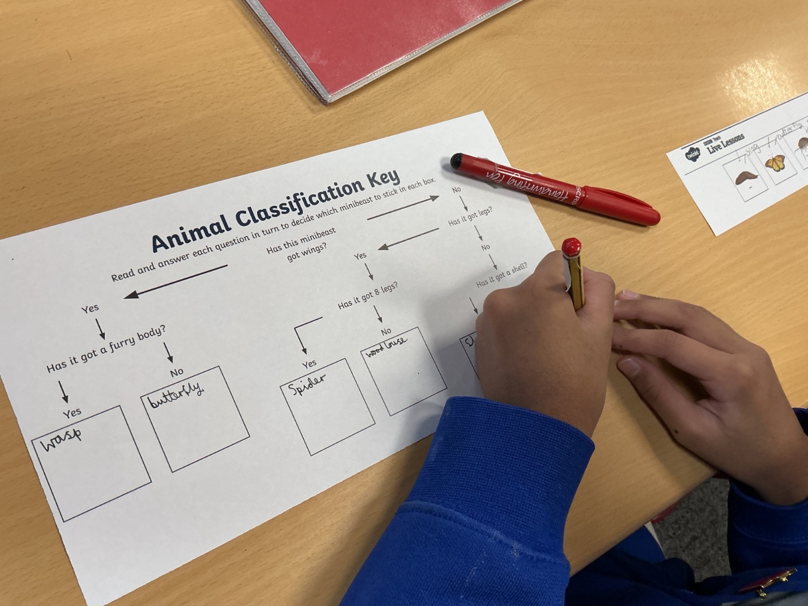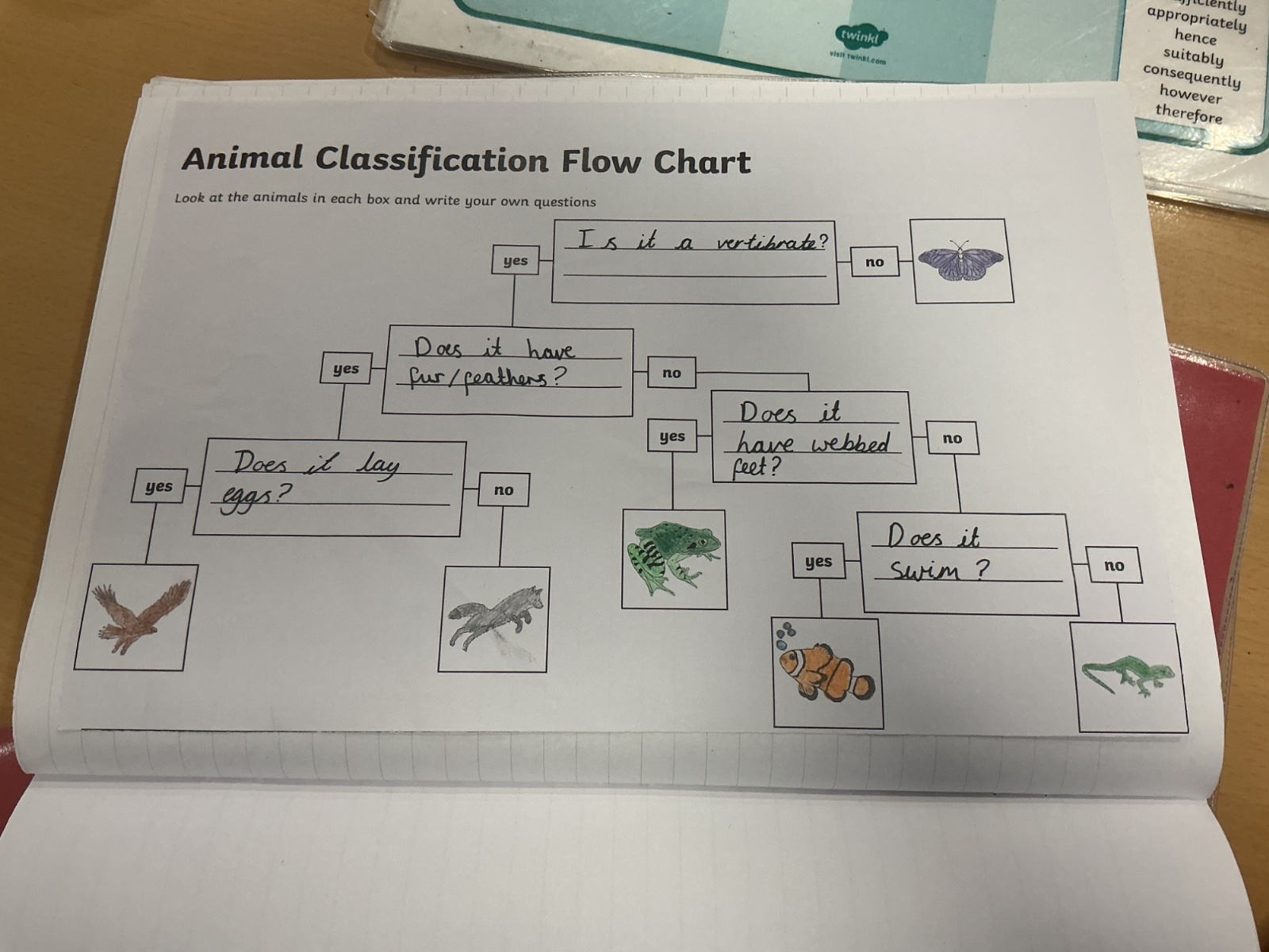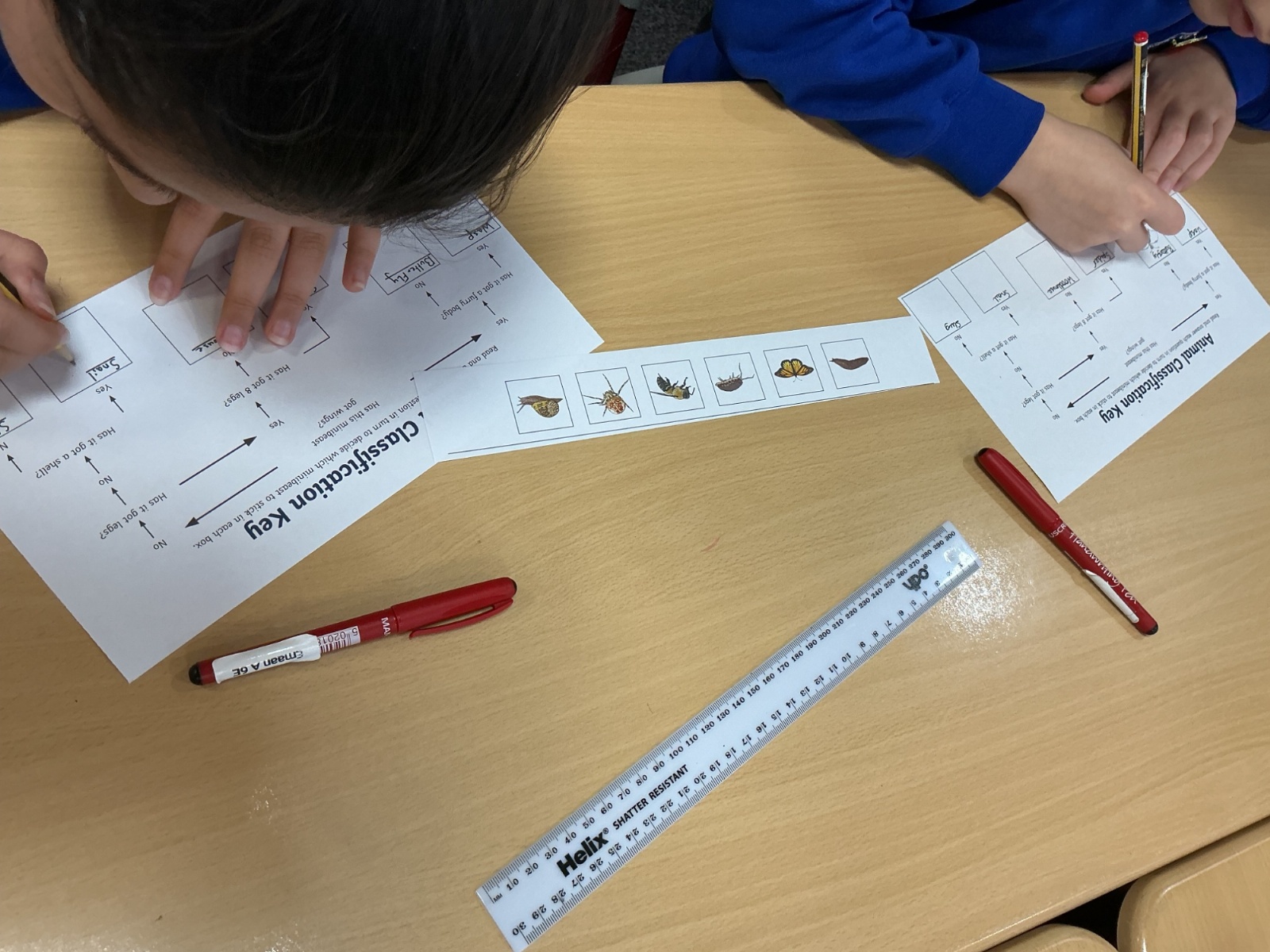 We discussed the animals that we saw when walking to school or on the playground, reminding ourselves of the classification features, such as vertebrate or invertebrate. We then learnt how to correctly classify these animals using a key system, with uses key questions to group the animals, filtering them down to one eventually. We then created our own using the local animals.