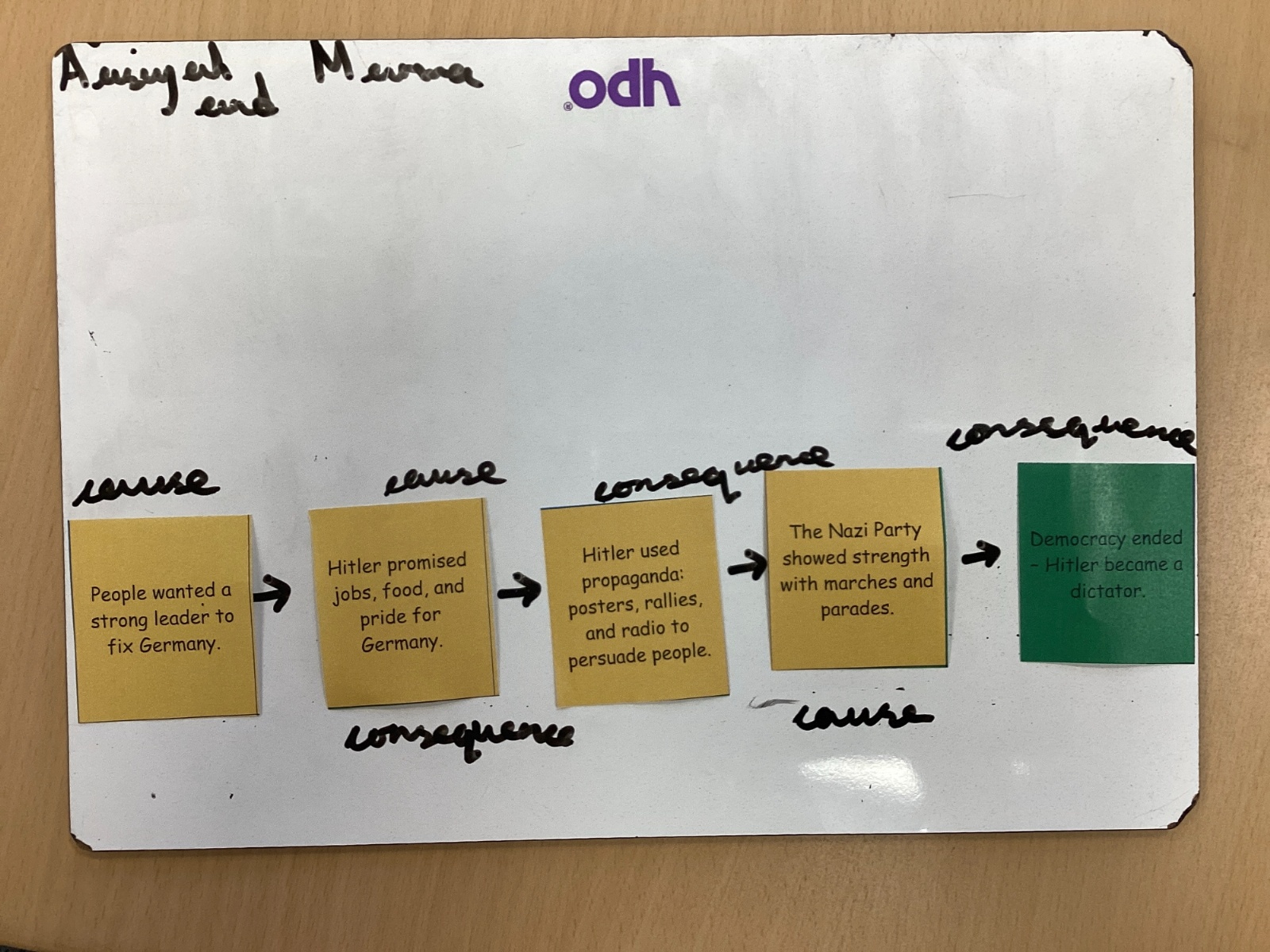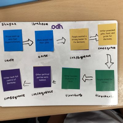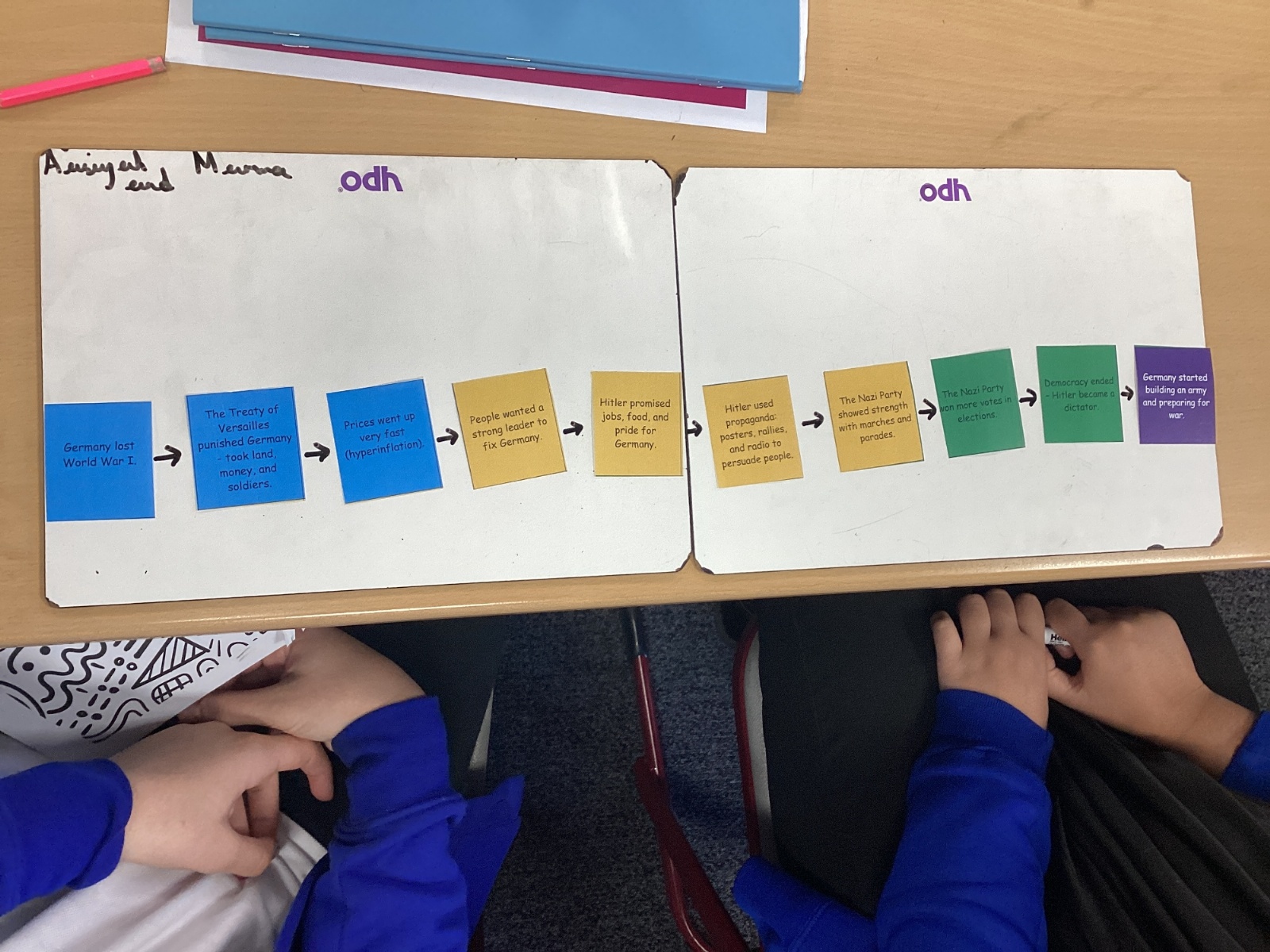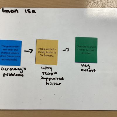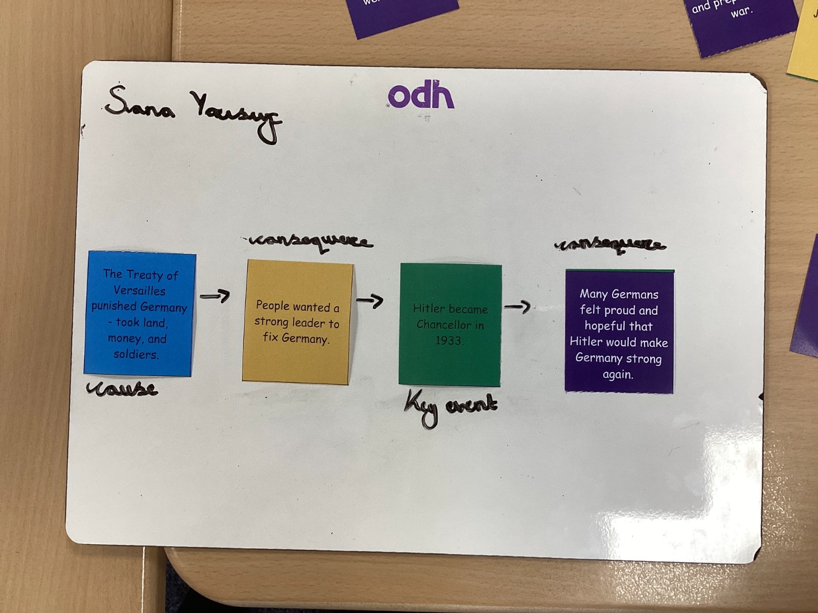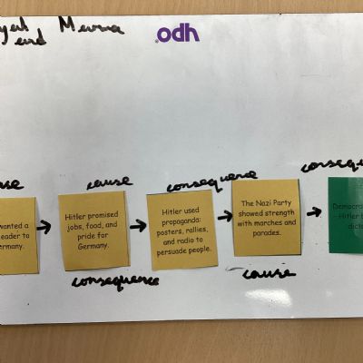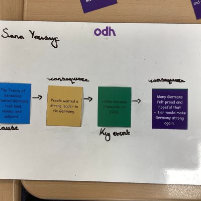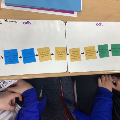 6K have been looking at the reasons why Hitler came to power. We looked at a variety of events during the 1920s and 1930s that all played a part in Hitler eventually taking control. The children then looked for links between the different events, making cause and consequence chains.