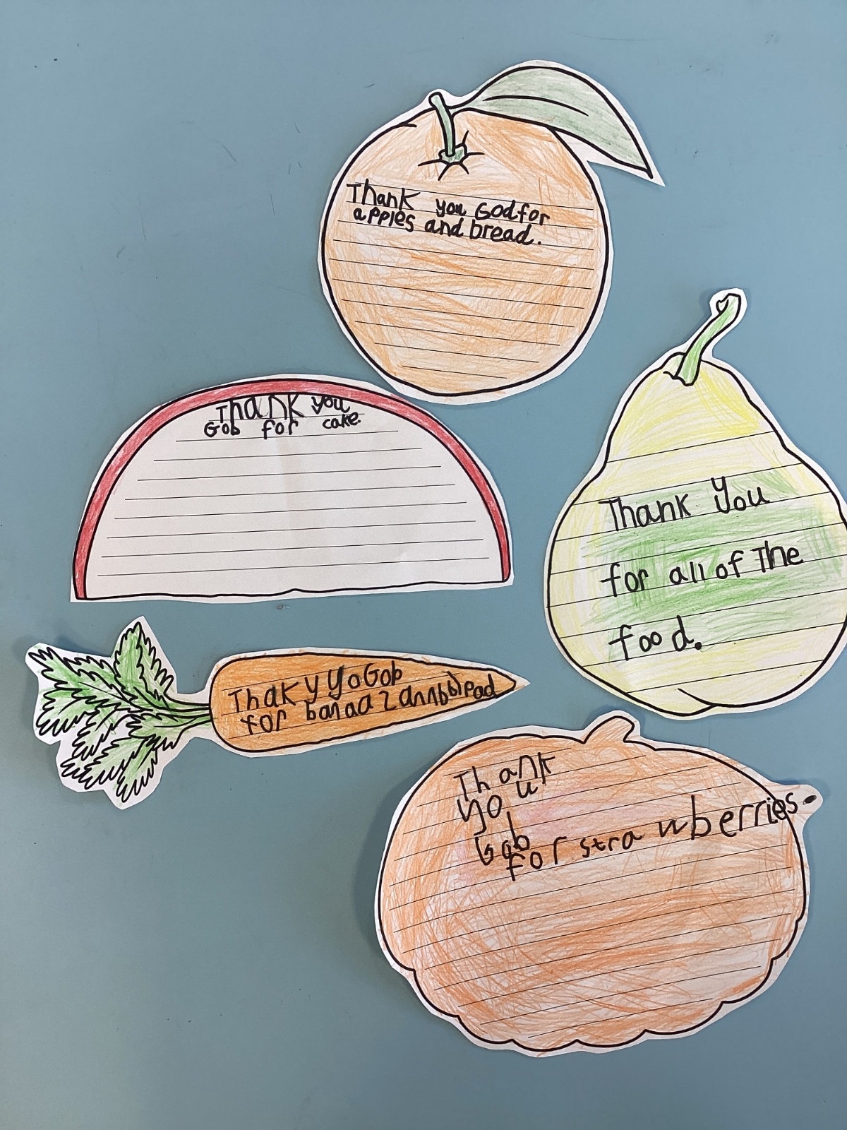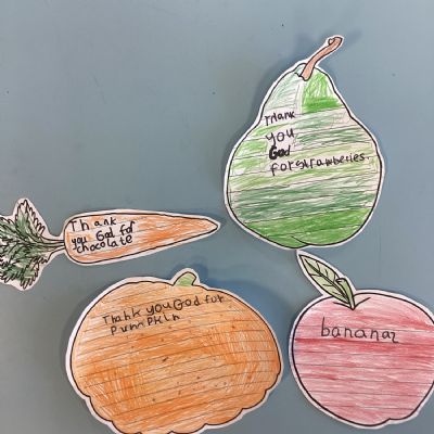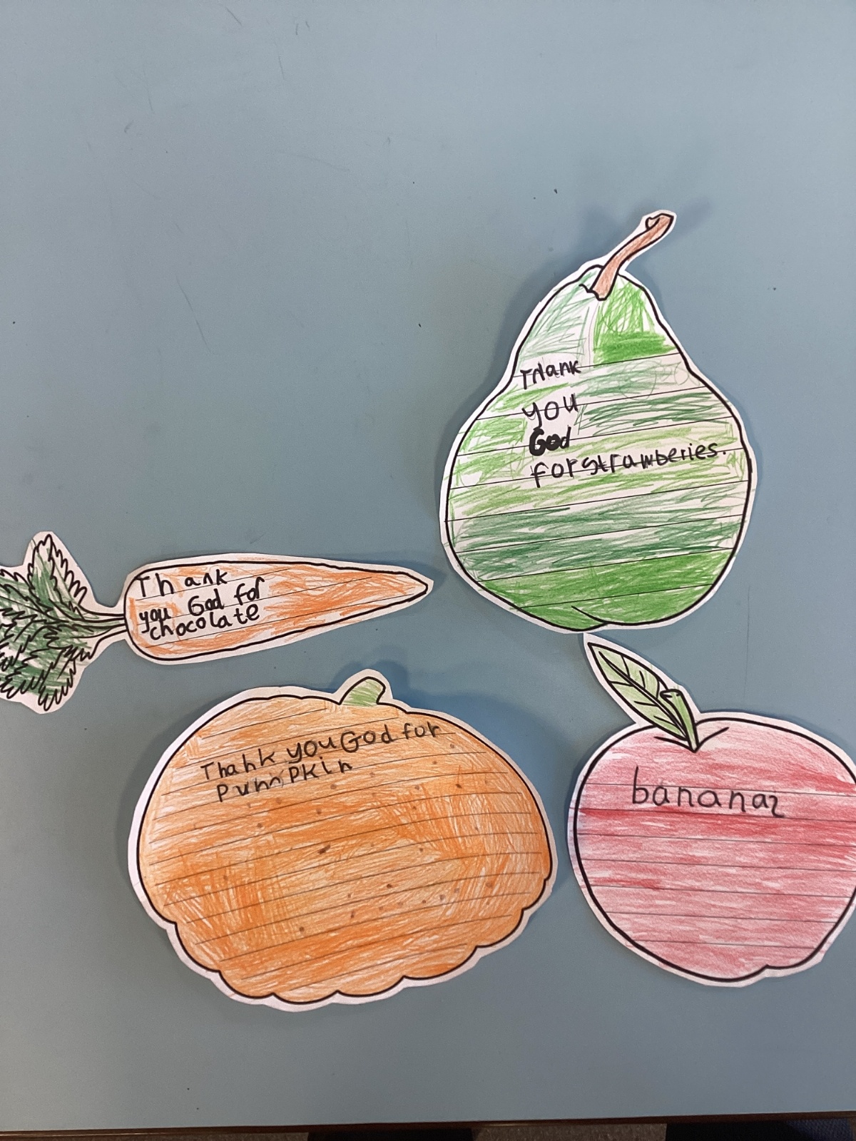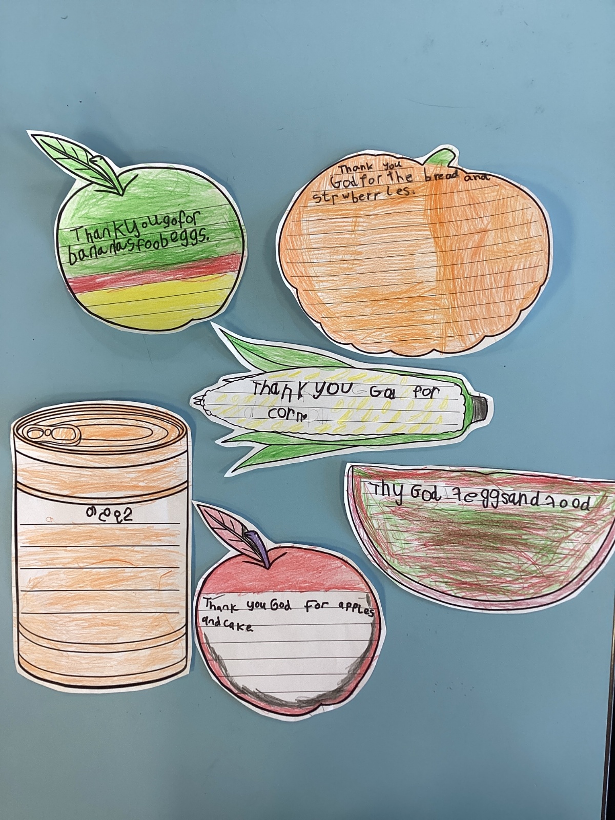 The children learned that Christian’s celebrate Harvest. They celebrate by praying and singing and also by collecting food for those that are less fortunate.