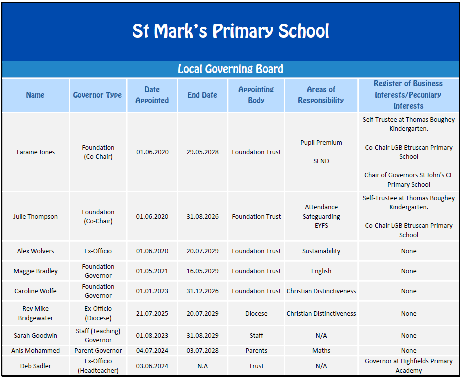 I came to Stoke on Trent originally for the Potteries and worked in Product Development and Marketing for the Wedgwood Group. I have lived in Shelton for over 30 years. I grew up in South East London and enjoy living in a multi-cultural community. I have more recently worked locally in schools as a Higher Level Teaching Assistant and in charities, including school work. I have seen for myself the benefit of the positive ethos of church schools with the aim of developing a rich curriculum to develop the whole child, as opposed to developing solely academically. As a long term member of a local church, I am pleased to be involved in supporting St Mark’s CE Primary as a Foundation Governor.
